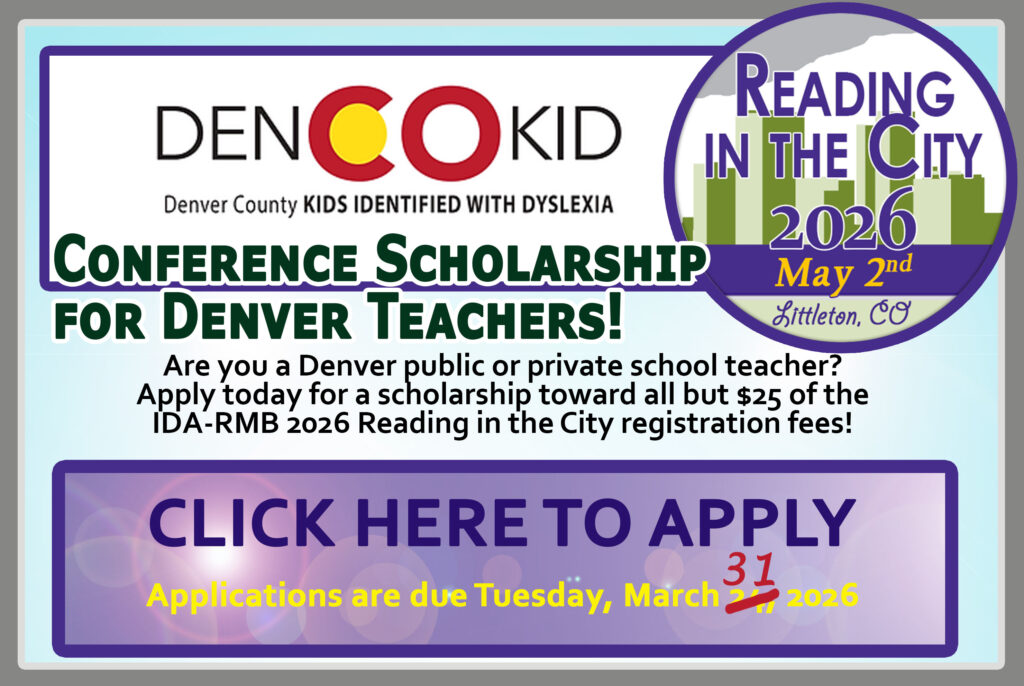 Reading in the City is an annual one-day educational event, run by the Rocky Mountain Branch of the IDA, and held at various locations within the conveniences of the metro-Denver area in Colorado. Catering to families and professionals who work with the dyslexia community, our topics are focused on the science of reading, brain research, practical application strategies, and the many ways we can provide research-backed support.